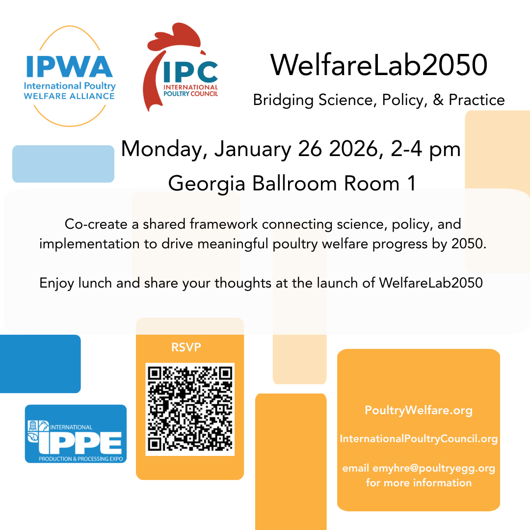 What Is WelfareLab 2050? WelfareLab2050 is a global initiative coordinated by the International Poultry Welfare Alliance working to improve animal welfare science, policy, and implementation through a structured, multi-stage approach spanning 2025–2050. The initiative builds on the 2024 Icebreaker Series, which brought together voices and expertise from around the world to identify the significant issues in poultry welfare, looking ahead to 2050. WelfareLab 2050 takes on the major issues identified by stakeholders. It begins to identify tangible actions that IPWA, its members, and partners can use to functionally advance and influence these priority areas in the coming years. Starting this year, IPWA will continue to have in-depth sprints with focus groups of different expertise to identify these actions. Why IPC for Sprint #1? The goal of WelfareLab 2050 is to improve welfare science, policy, and implementation. This approach respects variability in types of production systems and the point at which different regions are in their welfare journey. IPWA wants to collaborate with IPC and its Members to draft ideas and understand what is needed to advance science-based poultry welfare policies so that the outcomes of this effort are helpful across a diverse landscape of political climates worldwide. Following the conclusion of the IPC meetings on Monday, January 26th, please attend a facilitated, interactive discussion to help shape the future direction of poultry welfare worldwide. Contact emyhre@poultryegg.org for any details. ![]() |