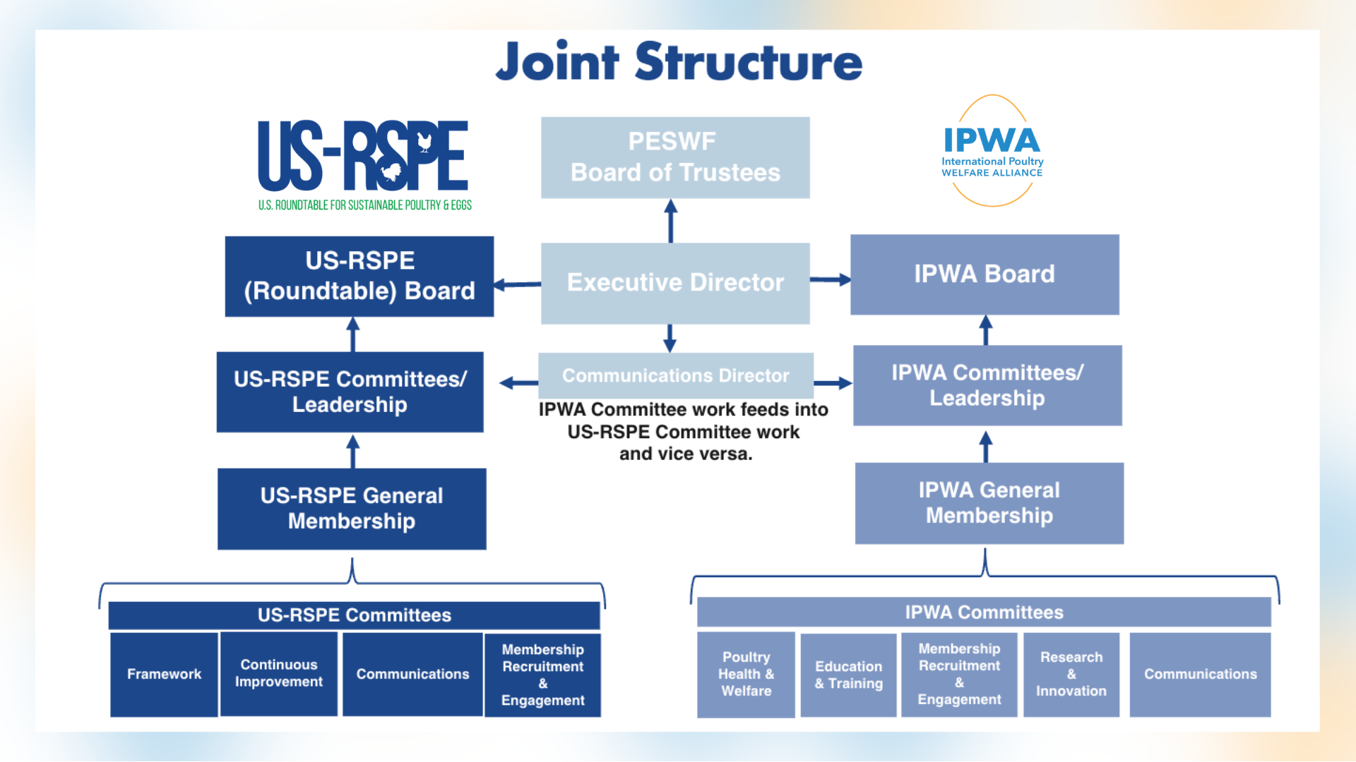 IPWA recognizes that poultry welfare cannot be viewed as a standalone topic. IPWA believes that welfare must be viewed, discussed and promoted in a manner that reflects global awareness, improves sustainable food production practices, builds community trust, and emphasizes a commitment to scientific and technological knowledge that will benefit poultry. Joint membership and collaborative leadership from IPWA and US-RSPE allow members to collaborate on various themes related to poultry welfare and sustainability.